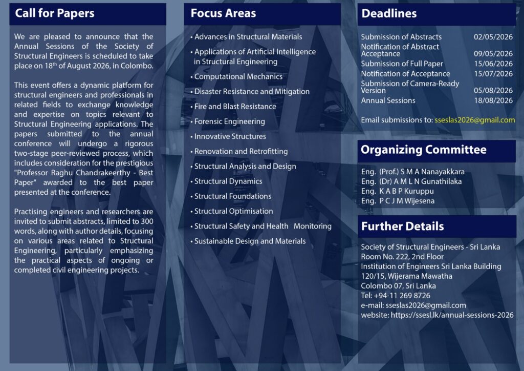 The Society of Structural Engineers Sri Lanka is a professional body for Practicing Engineers and academics active in the field of structural Engineering in Sri Lanka. It has over 700 members working in all corners of the country in the field of structural engineering. ( Established in 1990 and Incorporated by Parliament of Sri Lanka Act No 40 of 2009 )